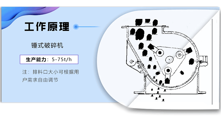 錘式破碎機電動機帶動轉子在破碎腔內高速旋轉。物料自上部給料口給入機內,受高速運動的錘子的打擊、沖擊、剪切、研磨作用而粉碎。在轉子下部,設有篩板、粉碎物料中小于篩孔尺寸的粒級 通過篩板排出,大于篩孔尺寸的粗粒級 阻留在篩板上繼續受到錘子的打擊和研磨, 然后通過篩板排出機外。