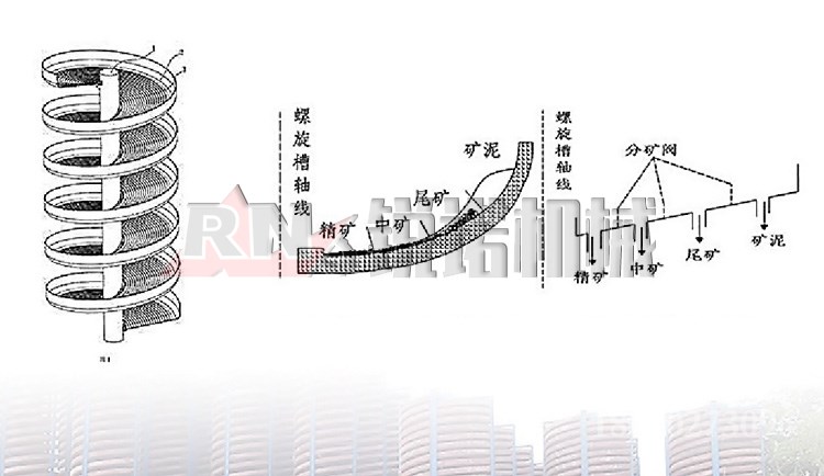 將螺旋溜槽立起,校準垂直線,用鐵架或木頭固定在合適的位置,由砂泵將礦砂送到螺旋上頂兩個進料口處,加入補充水,調(diào)節(jié)礦槳濃度,礦槳自然從高往下旋流, 在旋轉(zhuǎn)的斜面流速中產(chǎn)生一種慣性的離心力,以礦砂的比重、粒度、形狀上的差異,通過旋流的重力和離心力的作用,將礦與砂分開,精礦流入精礦斗用管道接出, 尾砂流進尾砂斗用管道接到砂池,再用砂泵排走,完成了選礦的全過程。