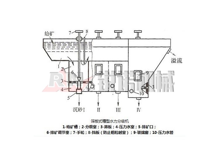 礦漿由一側給入,依次進到各室中,各室的上升水速逐漸減小。由此得出由粗到細的各級產物。分級室內上升水速分布是否均勻,對分級效果有重要影響。